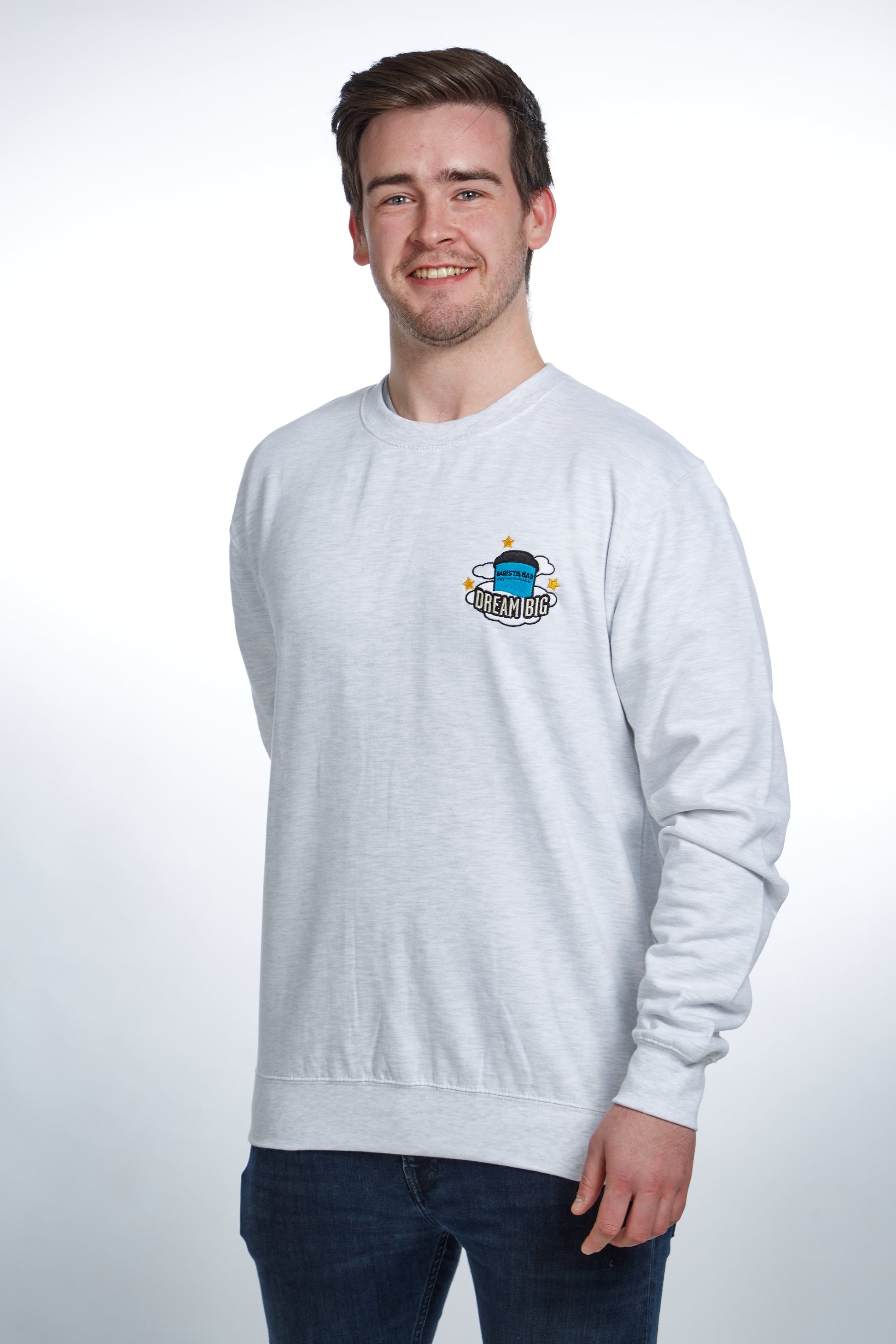 Unisex crewneck cotton and polyester sweater with embroidered 'Dream Big' design in Ash.