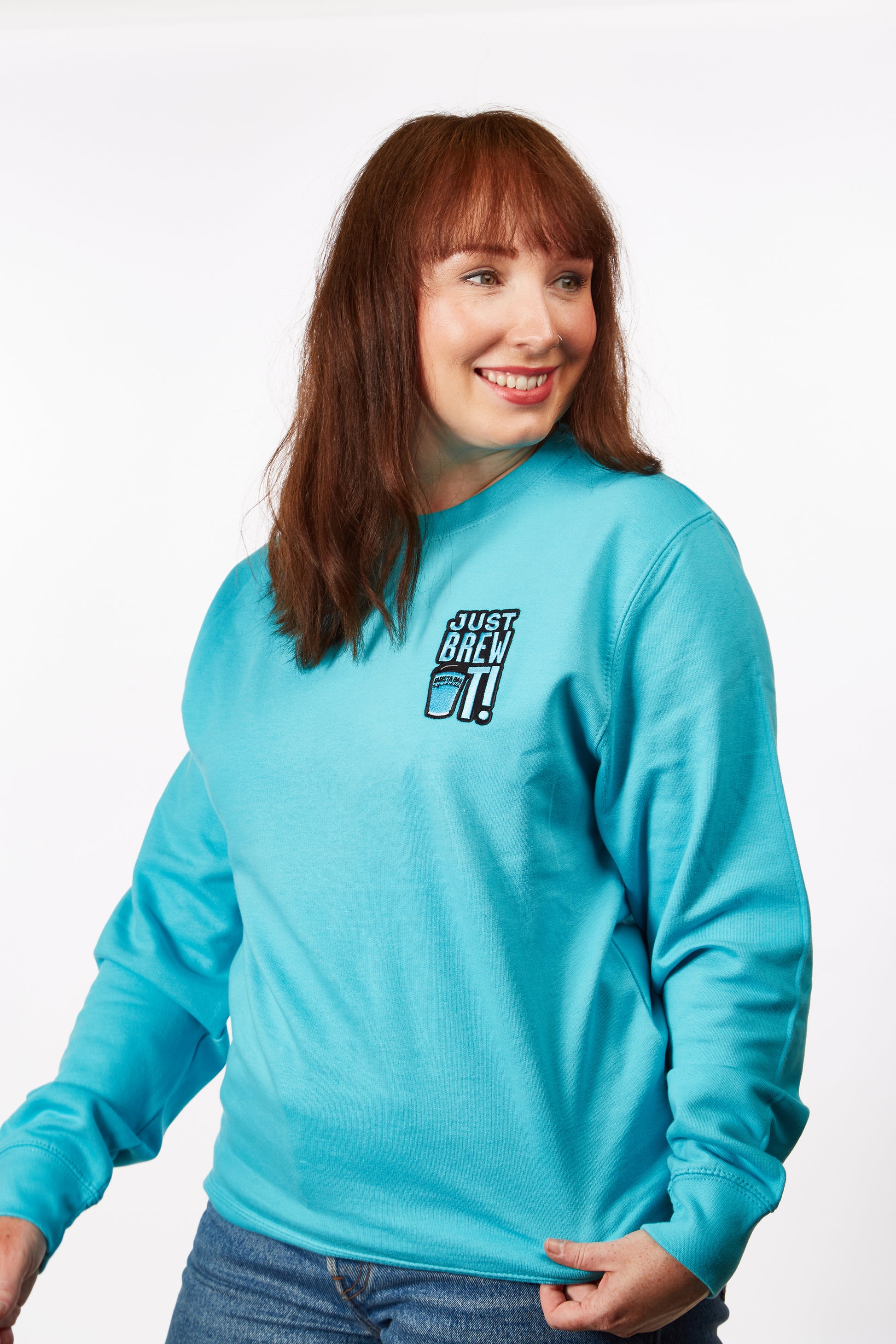 Unisex crewneck cotton and polyester sweater with embroidered 'Just Brew It' design in Turquoise Surf.